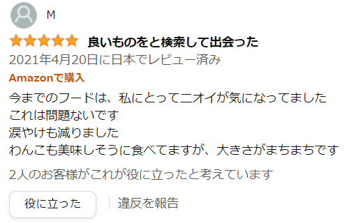 肯定的なレビューは、食いつきがよい、涙やけがよくなったというものが多いです。