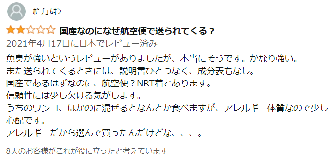 この3つのネガティブのこと以外、口コミでは、魚臭いのが気になるという評価が多かったです。