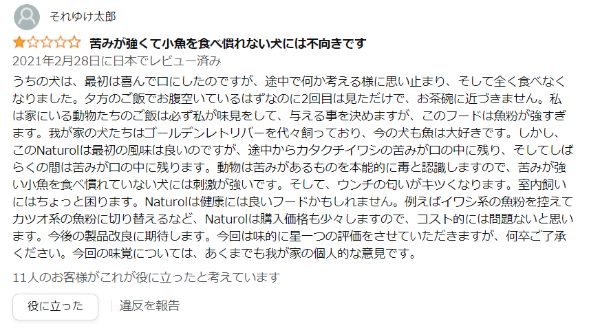 批判的なレビューは、魚の匂いがきついというのが多いです。また、イワシの苦みがあるという評価もあります。