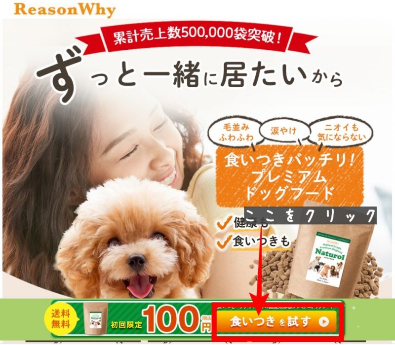 「ナチュロル らくトク犬康コース 850g×2袋定期コース 初回30gお試し」で30gを100円でお試しすることが出来ます。