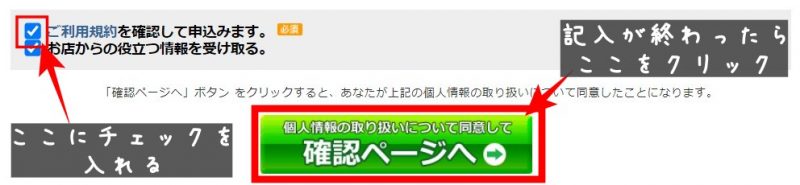 すべての記入が終わったら、「ご利用規約の確認」にチェックを入れて、「確認ページへ」をクリックしてください。