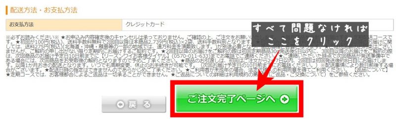 最後にお支払方法が間違っていなければ、「ご注文完了ページへ」をクリックしてください。