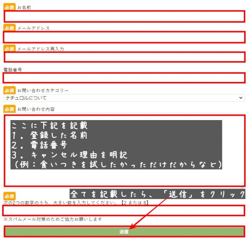以上の内容を記載し、送信してください。解約はお試し発送から5日以内なので、注意してください。